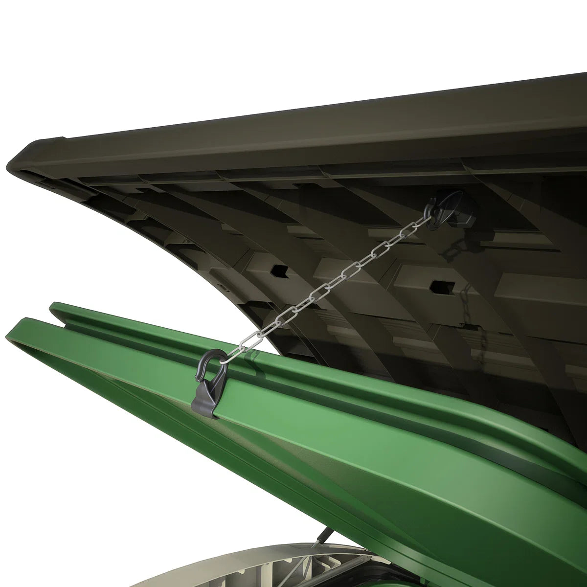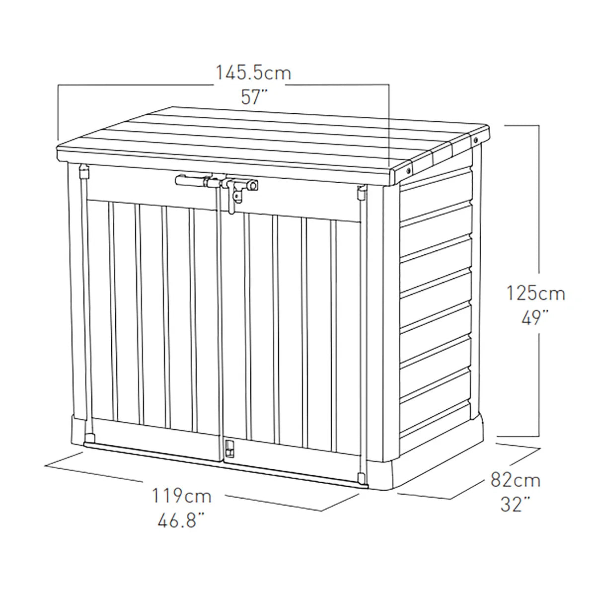 This best-selling outdoor storage unit is designed for quick assembly, effortless use and long-lasting performance. Perfect for storing barbecues, outdoor furniture, garden tools or even two 240 L wheelie bins, it offers a generous 1200 L / 42 cu.ft. capacity. Its compact yet spacious design features both top and front access, a sloped threshold for easy loading, and a convenient bin-opening kit. Built from durable, weather-resistant materials, it keeps all your items dry, protected and well-organised year-round.
